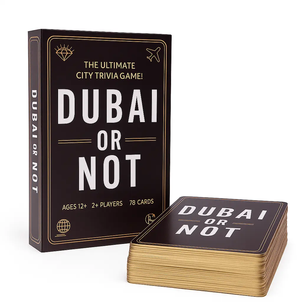 A Belgian-designed trivia game created in Dubai, filled with city fun facts, world records, and one simple question: Is it about Dubai… or not?