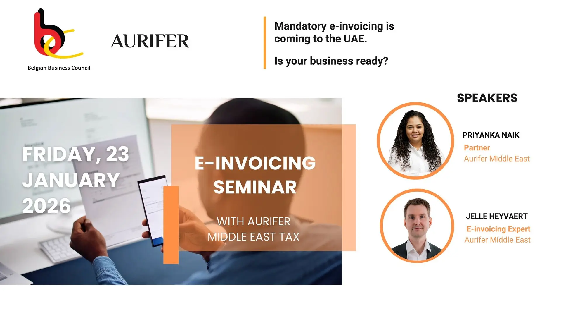 Join us for an interactive session where experts from BBC Gold Member Aurifer Middle East Tax Consultancy break down what this change really means for your organization, who is in scope, which transactions require structured e-invoices, key timelines and deadlines, and how to prepare for this change.