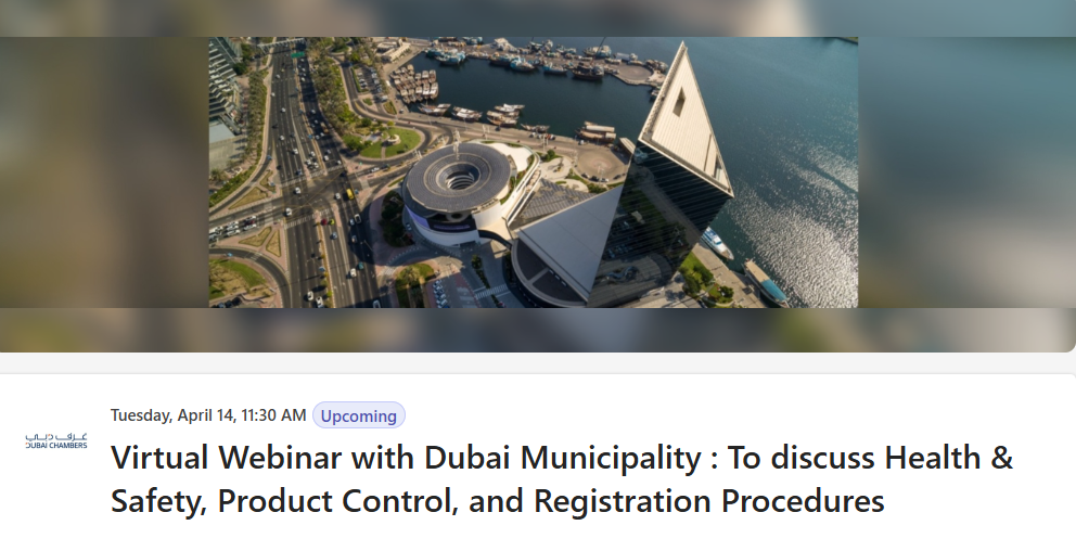 Dubai Chambers is pleased to invite the business community to a virtual workshop, organized in collaboration with Dubai Municipality, to present and discuss Health and Safety, Product Control, and Registration procedures, as well as logistics challenges in light of the current situation.